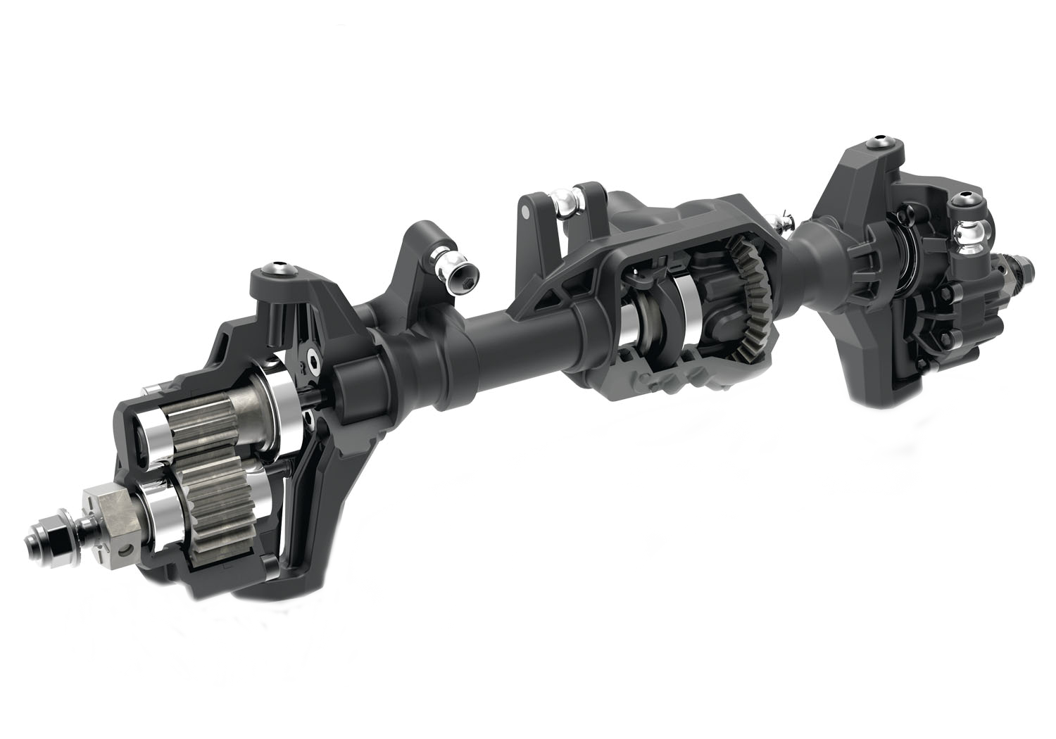 Portal axle geometry raises the axle link mounts and center driveshaft, greatly reducing critical driveshaft and suspension link angles.